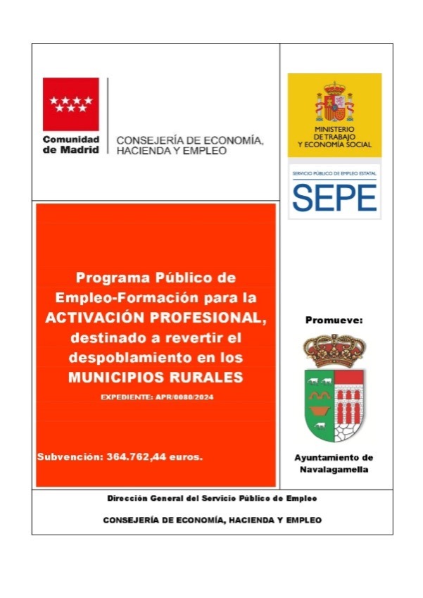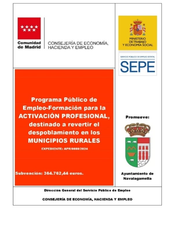 El Ayuntamiento de Navalagamella ha resultado beneficiario de una subvención concedida por la Consejería de Economía, Hacienda y Empleo de la Comunidad de Madrid procedente de los fondos que el Servicio Público de Empleo Estatal distribuye para su gestión por las comunidades autónomas para la puesta en marcha de programas y políticas activas de empleo.